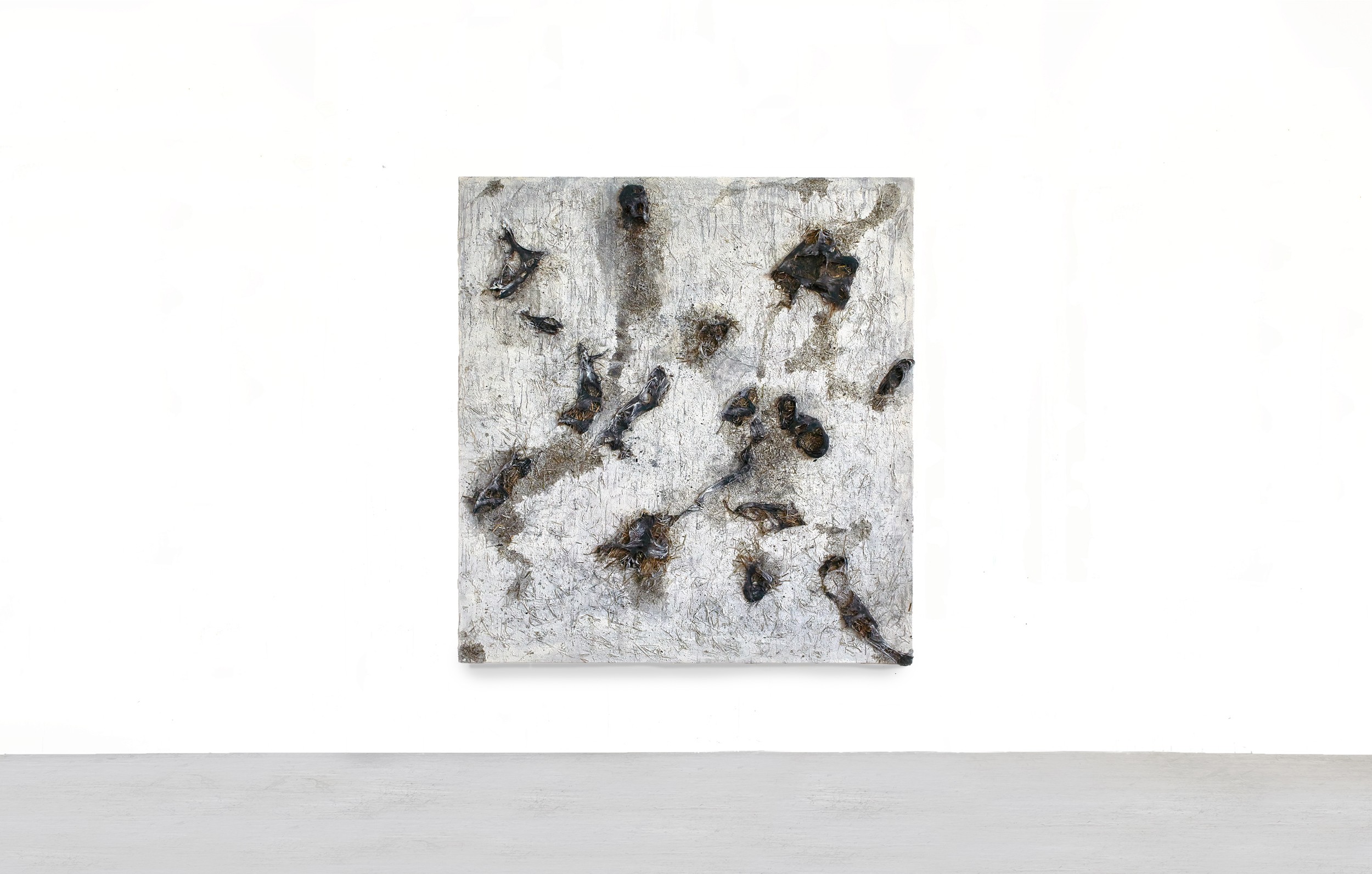Acrylic, mixed media, and collage on canvas, 200 x 190 cm, 2023 / A Kafkaesque Being Savoring the Earth's Warmth, wax, polyurethane, plant, fabric, 2023